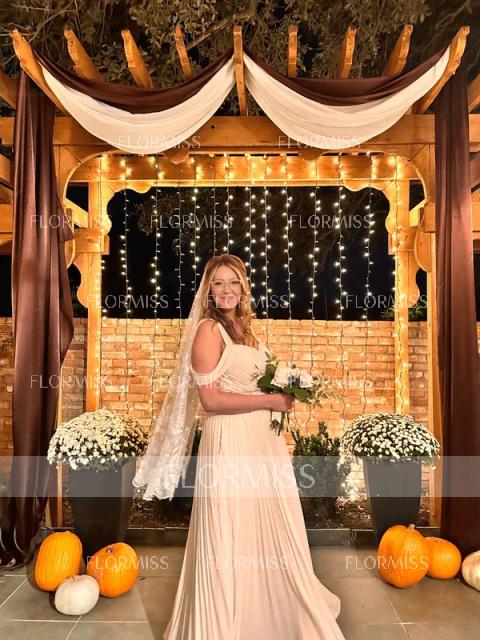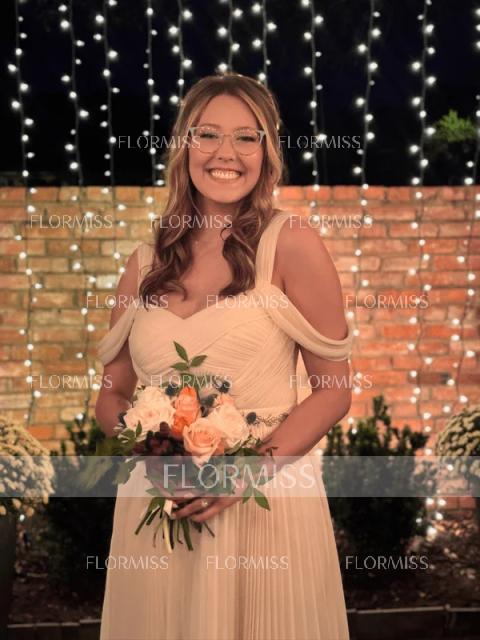 A graceful A-line bridesmaid dress with a cold shoulder design and sleeveless cut. Crafted from lightweight chiffon, the dress features pleats that add texture and flow to the floor-length silhouette. Its soft, airy fabric creates an elegant and effortless look, perfect for a chic and stylish wedding.