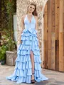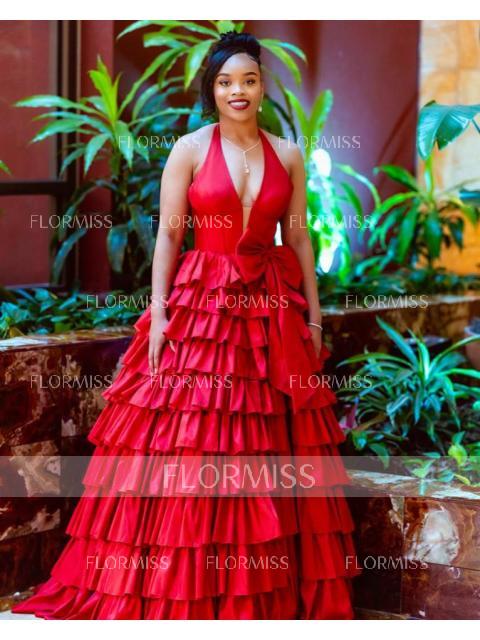 A-line Halter Bow Sweep Train Corset Porm Dress