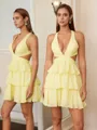 This A-line dress features a halter neckline and a sleeveless design that highlights the shoulders. Made from lightweight chiffon, the skirt is adorned with cascading ruffles that add movement and a playful touch. The short or mini length creates a youthful and elegant look, perfect for parties, summer events, or special occasions.