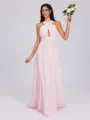 This graceful A-line bridesmaid dress features a chic halter neckline and a sleeveless design, offering a sophisticated yet romantic style. Crafted from lightweight chiffon, it drapes beautifully with delicate pleating that adds soft texture. The floor-length silhouette flows elegantly, making it a perfect choice for weddings and formal occasions.