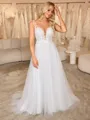 This stunning A-line wedding dress features an illusion neckline and sleeveless design that beautifully blend elegance with modern style. Crafted from soft tulle, the bodice is adorned with delicate lace appliques that create a romantic and intricate look. The corset waist cinches the figure for a flattering silhouette, while the sweep-length train flows gracefully behind, perfect for a timeless and graceful bridal appearance.