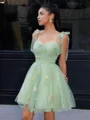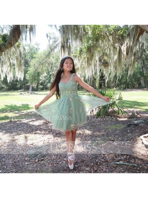This is a charming short/mini dress with an A-line silhouette and a sleeveless design. It features delicate lace straps and floral embellishments, creating an enchanting and graceful look.