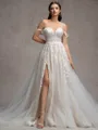 Elegant A-line wedding dress with an off-the-shoulder neckline, sleeveless design, and delicate lace appliques. The gown features a graceful chapel train crafted from soft and airy tulle, creating a romantic and timeless bridal look with a touch of sophistication.