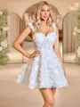 This elegant A-line wedding dress features an off-the-shoulder neckline that beautifully showcases the shoulders and collarbones. The sleeveless bodice is adorned with delicate lace appliques, adding romantic detail and texture. The fitted corset waist flatters the silhouette, while the short/mini length offers a modern, playful touch-perfect for a stylish bride seeking both elegance and ease of movement.