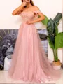 • A-line Off-the-Shoulder Appliques Lace Sweep Train Corset Porm Dress