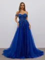 • A-line Off-the-Shoulder Appliques Lace Sweep Train Tulle Corset Dress