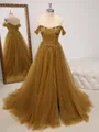 • A-line Off-the-Shoulder Appliques Lace Sweep Train Tulle Corset Porm Dress
