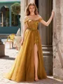 A stunning A-line dress with an off-the-shoulder, sleeveless design, crafted from delicate tulle and adorned with intricate lace appliques. The corset bodice enhances the silhouette, while the sweep train adds an elegant and graceful finish. Perfect for weddings or formal occasions.