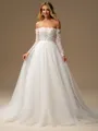 • A-line Off-the-Shoulder Long Sleeves Appliques Lace Chapel Train Tulle Corset Wedding Dress