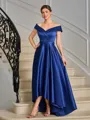 A stunning A-line Mother of the Bride dress featuring an off-the-shoulder design and sleeveless cut. The dress is beautifully pleated, adding texture and flow, with an asymmetrical hem that offers a modern and unique touch. Made from luxurious satin, it provides a flattering and smooth fit. The sophisticated silhouette makes it an ideal choice for a stylish and memorable appearance on the special day.