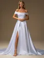 A-line Off-the-Shoulder Pleated Chapel Train Satin Corset Wedding Dress