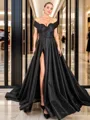 This sleeveless satin dress showcases an A-line silhouette with an off-the-shoulder neckline, exuding elegance and charm. Adorned with delicate pleats, it adds dimension to the design. Completed with a sweeping train, this dress is perfect for formal occasions, radiating sophistication and grace.