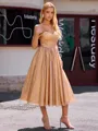 Step into classic elegance with this A-line dress featuring an off-the-shoulder neckline and sleeveless design. The dress falls to a flattering tea-length, with a gently pleated skirt that adds a touch of sophistication and grace. Ideal for formal gatherings and events where understated charm is key.
