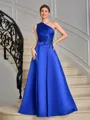A stunning A-line Mother of the Bride dress featuring a one-shoulder design and sleeveless cut. The dress is beautifully embellished with appliqu