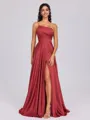 This elegant A-line bridesmaid dress features a stylish one-shoulder neckline and a sleeveless design, creating a modern and sophisticated look. Made from silk like satin, it has a smooth, comfortable fit with pleated detailing that adds a touch of refinement. The floor-length silhouette flows gracefully, making it an ideal choice for weddings and formal occasions.