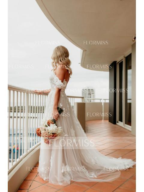 A-Line/Princess Off-the-Shoulder Court Train Tulle Wedding Dresses With Appliques Lace