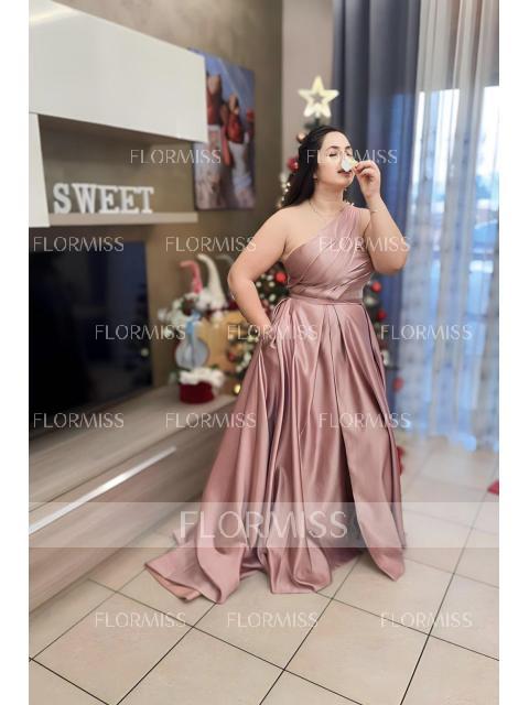 • A-Line/Princess One-Shoulder Sweep Train Satin Prom Dresses With Pockets