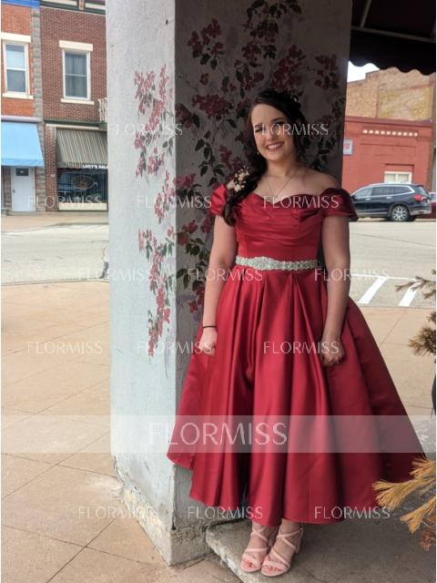 • A-Line/Princess Satin Ruched Off-the-Shoulder Sleeveless Tea-Length Dresses