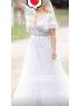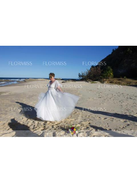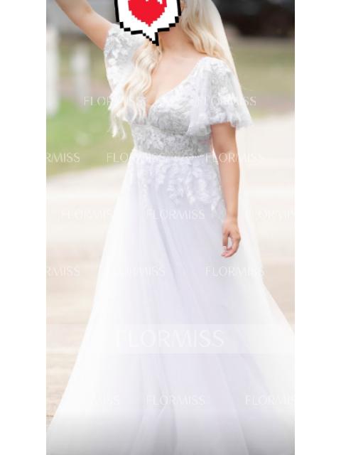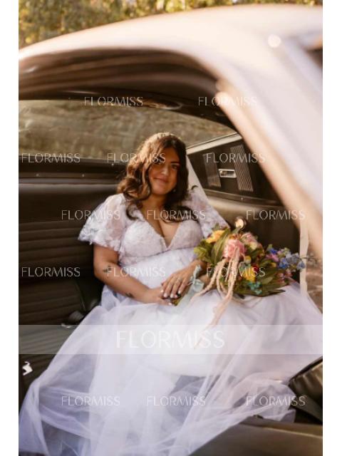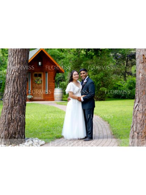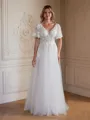 A-Line/Princess Tulle Lace V-neck Short Sleeves Floor-Length Wedding Dresses