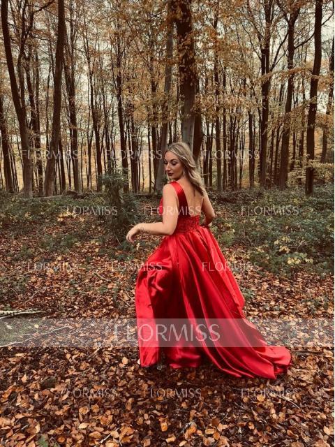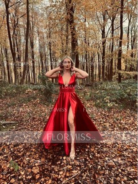• A-Line/Princess V-neck Sweep Train Silk Like Satin Prom Dress With Leg Slit