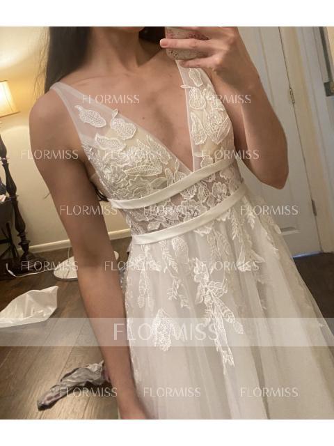 • A-Line/Princess V-neck Sweep Train Lace Wedding Dresses With Belt/Sash