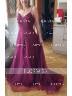 • A-Line/Princess V-neck Sweep Train Tulle Prom Dress With Appliques Lace