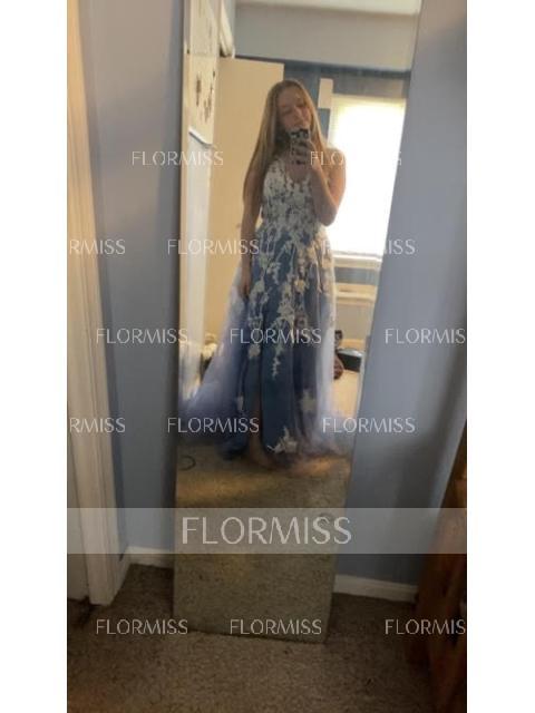 • A-Line/Princess V-neck Sweep Train Tulle Prom Dress With Leg Slit