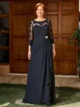 This floor-length chiffon mother of the bride dress features an A-line silhouette, offering a flattering and timeless look. The scoop neckline and 3/4 sleeves add an elegant touch, while delicate lace appliques adorn the ensemble, providing a romantic and feminine vibe. Perfect for a mother who desires a sophisticated and graceful appearance for her daughter's wedding.