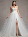 Elegant A-line wedding dress featuring spaghetti straps, a sleeveless design, and delicate lace appliques. The gown is adorned with a chapel train crafted from graceful tulle, and the corset detail adds a touch of sophistication to create a timeless and romantic bridal ensemble.