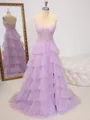 A beautiful A-line dress with spaghetti straps and a sleeveless design, crafted from soft tulle and adorned with intricate lace appliques. The corset bodice provides a flattering, structured fit, while the sweep train adds a graceful, flowing finish. Ideal for weddings or formal occasions.