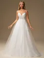 Exude timeless romance in this A-line wedding dress, featuring delicate spaghetti straps and a flattering sleeveless design adorned with intricate lace appliques. Crafted from airy tulle, it cascades gracefully to the floor with a sweeping train, adding an extra touch of elegance. Perfect for the bride seeking classic beauty and sophistication with a hint of whimsical charm on her special day.
