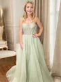 This dress is an A-line silhouette with delicate spaghetti straps, adorned with beading details, and a sweeping train made of airy tulle. The corset bodice adds a touch of refinement, creating a captivating and graceful look for special occasions.