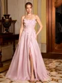Step into romance with this A-line prom dress featuring delicate spaghetti straps and a sleeveless design. Crafted from soft tulle, the floor-length silhouette is adorned with charming floral details, creating an elegant and feminine look perfect for making a memorable entrance at any formal event.