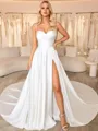 This graceful A-line wedding dress combines delicate spaghetti straps with a sleeveless design to beautifully highlight the shoulders. Crafted from a luxurious blend of satin and chiffon, the bodice features elegant pleating that adds texture and sophistication. The corset waist cinches the figure for a flattering silhouette, while the chapel-length train flows gently behind, offering timeless elegance and romance.