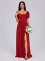 This lovely A-line dress features a square neckline and short sleeves, with a charming bow detail at the waist. The floor-length chiffon fabric flows gracefully, creating a refined and elegant silhouette.