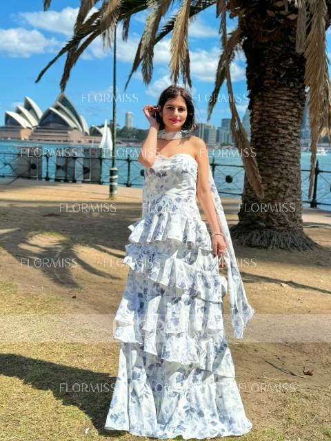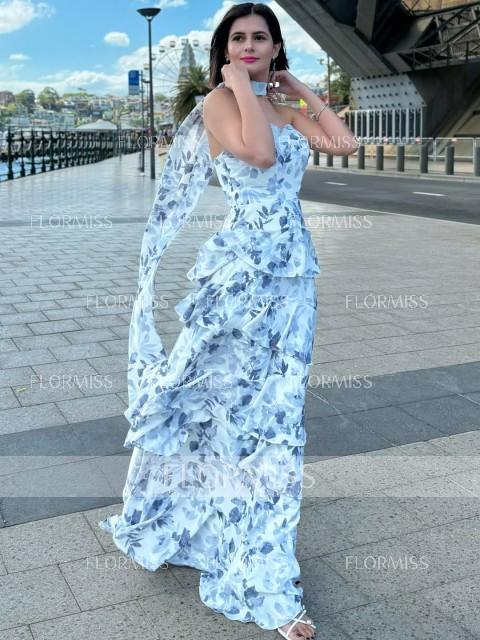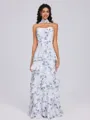 This elegant A-line dress features a straight neckline and sleeveless design, with cascading ruffles that add a touch of sophistication. The floor-length chiffon fabric flows beautifully, creating a graceful and refined silhouette.