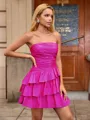 Step into chic sophistication with this A-line dress featuring a straight silhouette and sleeveless design. The short, mini-length taffeta skirt is adorned with cascading ruffles, adding a touch of whimsical charm and movement to the ensemble. Perfect for special occasions where you want to showcase a blend of elegance and playful elegance.
