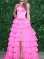 A beautiful A-line dress featuring a straight neckline and sleeveless design, crafted from soft chiffon for an ethereal, flowing effect. The corset bodice provides a flattering, structured fit, while cascading ruffles add texture and movement to the silhouette. The sweep train adds an elegant finish, making this dress perfect for weddings, proms, or formal events. Combining modern elegance with timeless romance, it