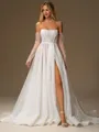 Radiate timeless beauty in this A-line wedding dress, boasting a straight neckline, elegant long sleeves, and a graceful chapel train. With a flattering corset bodice, this gown exudes classic charm and sophistication. Perfect for a bride seeking a blend of traditional elegance and modern allure on her special day.