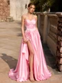 A-line straight silhouette prom dress featuring a sleeveless design. Crafted from silk-like satin, it showcases a sweep train for elegant movement. The bodice is adorned with sparkling rhinestones, adding a glamorous touch to the overall look.