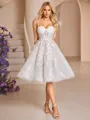 This elegant A-line wedding dress features delicate straps and a sleeveless design that beautifully highlights the shoulders. The bodice is adorned with intricate lace appliques, adding romantic texture and detail. The fitted corset waist enhances the silhouette, while the knee-length skirt offers a chic and comfortable style-perfect for a bride seeking classic elegance with modern ease.