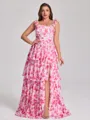 This A-line bridesmaid dress features slender straps and a sleeveless design for a light, elegant look. Cascading ruffles add movement and feminine charm. The corset bodice shapes the waist, while the floor-length skirt creates a graceful silhouette-perfect for plus size bridal parties.