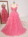 • A-line Straps Cascading Ruffles Sweep Train Tulle Corset Porm Dress