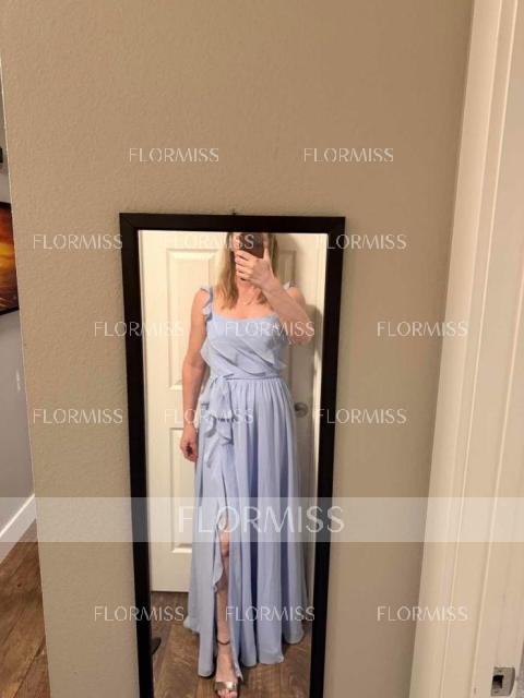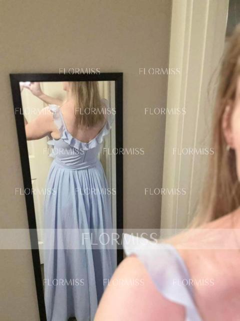 A romantic A-line bridesmaid dress featuring delicate straps and a sleeveless design, beautifully enhanced with soft ruffle details. Crafted from airy chiffon, the floor-length skirt flows gracefully, offering an elegant and flattering silhouette. The ruffles add a touch of charm and movement, making this dress perfect for a dreamy, feminine look. Ideal for weddings in any season, it combines comfort, elegance, and timeless style for a stunning bridal party appearance.