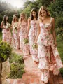 This bridesmaid dresses feature an A-line cut with sleeveless design and delicate straps. They are adorned with flowing ruffles and crafted in a floor-length style, combining elegance with grace.