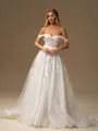 Capture timeless romance in this A-line wedding dress, featuring a sweetheart neckline, sleeveless design, and delicate lace appliques. Crafted from airy tulle, it showcases a graceful chapel train and a flattering corset bodice.
