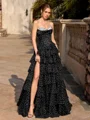 Turn heads in this A-line prom dress featuring a sweetheart neckline and sleeveless design. The floor-length silhouette is enhanced with cascading ruffles, creating a romantic and elegant look perfect for standing out at any formal occasion.