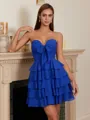 This A-line dress features a sweetheart neckline and a sleeveless corset bodice that enhances the waist. Made from soft chiffon, the skirt flows with cascading ruffles that add texture and movement. The short or mini length gives a youthful and elegant look, perfect for parties, proms, or special occasions.