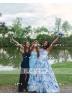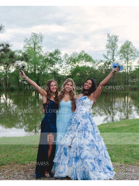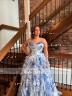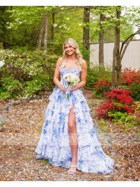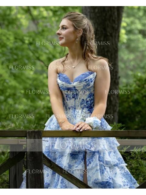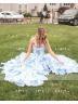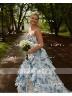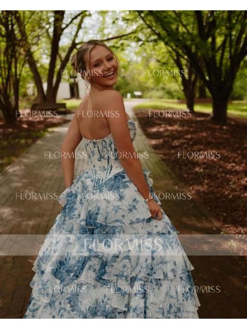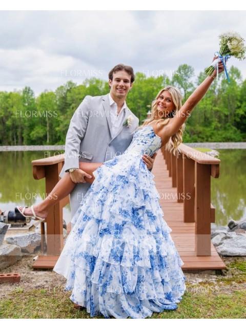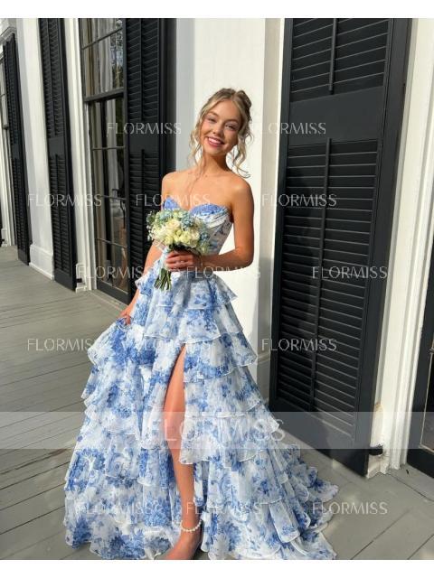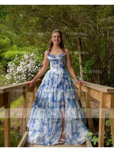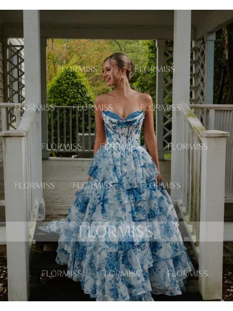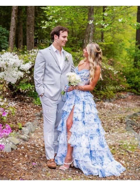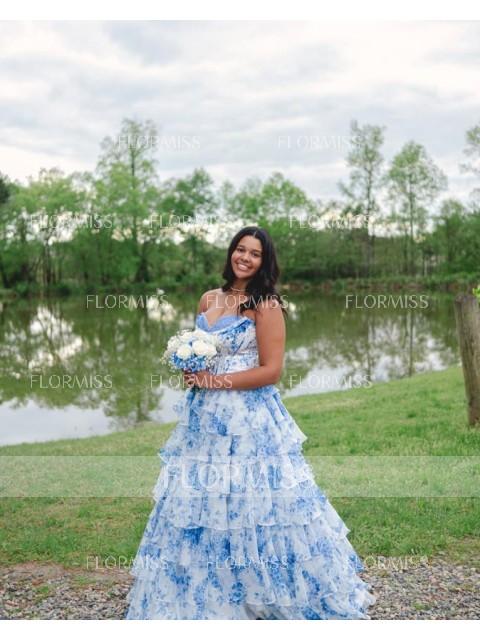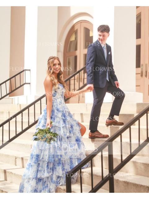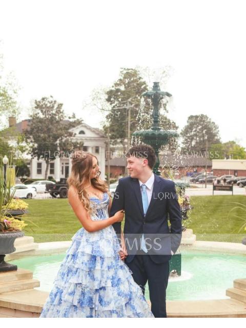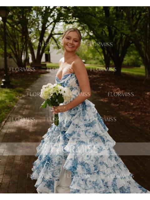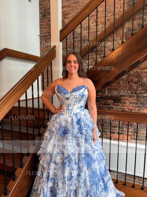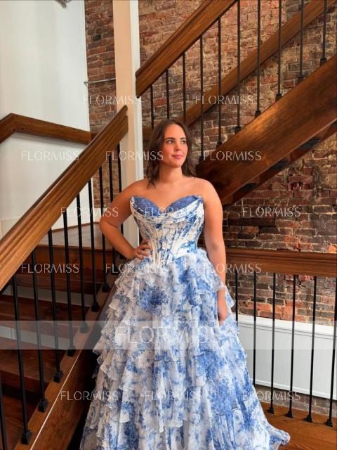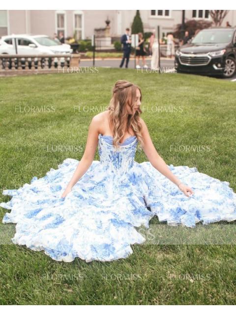 This breathtaking A-line dress features a flattering sweetheart neckline and a sleeveless design, creating a soft, feminine look. The cascading ruffles along the skirt add texture and volume, creating a stunning, dramatic effect as the dress flows. The corset-style bodice cinches the waist, enhancing the figure and providing a defined silhouette. The sweep train adds a touch of elegance and movement, making it perfect for formal occasions or weddings. Combining modern elegance with romantic details, this dress exudes timeless beauty and sophistication.