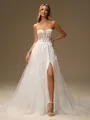 Exude timeless romance in this A-line wedding dress, boasting a sweetheart neckline, long sleeves, and delicate lace appliques. Crafted from airy tulle, it features a graceful chapel train and a flattering corset bodice. Perfect for a bride seeking classic elegance with a hint of whimsical charm on her special day.